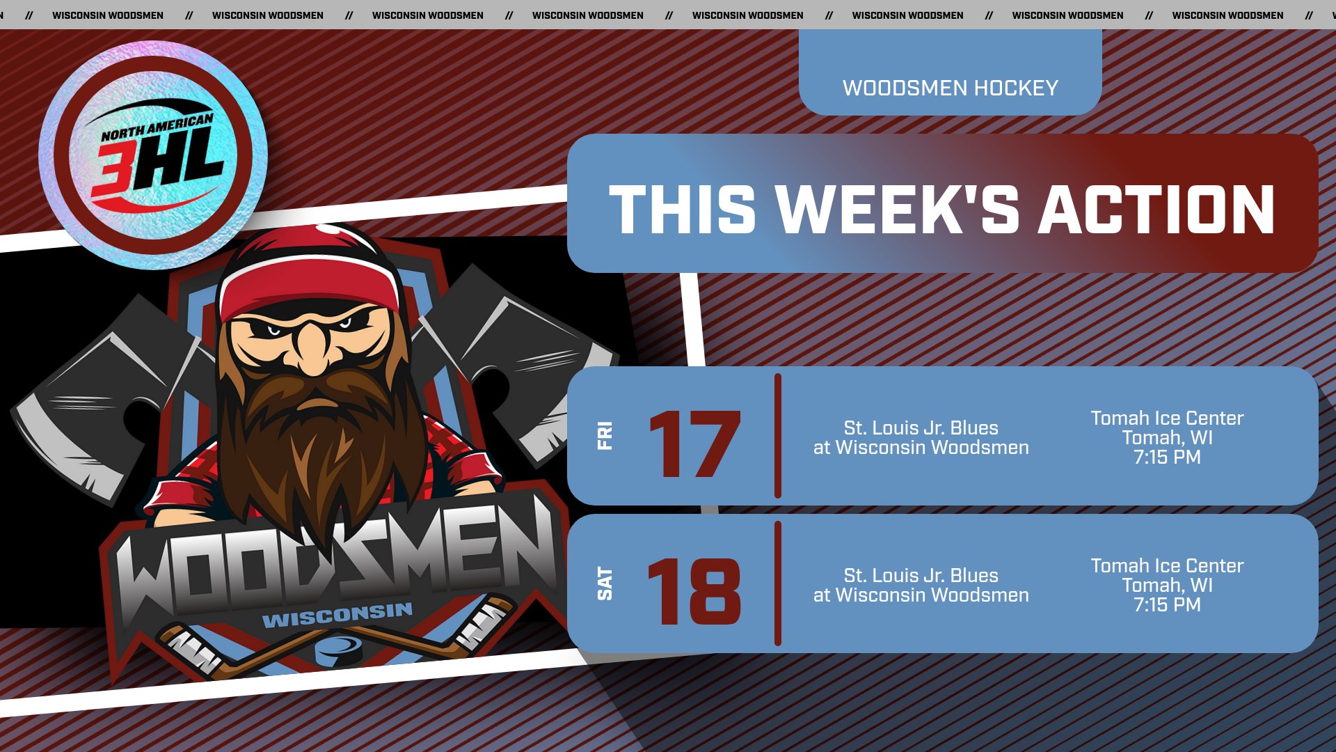 - LAST TIME OUT: Wisconsin came up empty in its first two meetings of the season against the league-leading Jr. Blues. St. Louis came away with 5-3 and 3-2 victories over the Woodsmen last weekend in Affton, Mo.